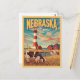 Fira Nebraskas charm med denna vintage-inspirerade vykortsdesign. Med betande kor, klassiska rödhöns och en slående fyr under en färgstark himmel, fångar denna bild av stil den amerikanska landsbygdsandan. Perfekt som en keepy, resegåva eller kollektiv för alla som kärlek Nebraskas unika landskapsvård.