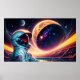 En futuristiska-scen skildrar en astronaut som står mitt i vibrerande, belysta stadsstrukturer under ett himmel som domineras av ett stort, glödande måne. Den reflekterande kostymen lägger till en mystisk och äventyrlig aura.