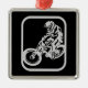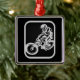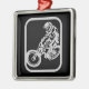 En nedförsbackscykel och en moder. Cykeln ritas i grått med "vit rymd"-teknik på svart bakgrund. Ryttaren går ner backe och får perspektiv av cykelns framhjul tittar större (närmare) än baktill.