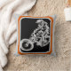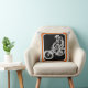 En nedförsbackscykel och en moder. Cykeln ritas i grått med "vit rymd"-teknik på svart bakgrund. Ryttaren går ner backe och får perspektiv av cykelns framhjul tittar större (närmare) än baktill.
