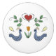 Keramisk knopp med Pennsylvania Dutch teckning med fåglar, hjärta och tulpaner. Bakgrundsbilden kan ändras