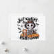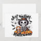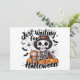 Skeleton Latte Countdown - Just Brewin’ Up Halloween Helgdag Card Den här lekande Halloween-designen har ett snyggt skelett i en häxhatt, omgiven av pumpor, fladdermus och kakor, som klämmer en pumpkryddlatte som det är årstidens läge. Den fräcka frasen "Just Waiting for Halloween" flyter ovan, och fångar blandningen av förväntan och mysiga fallviber. Med sin pulserande färg och humoristiska tvist är det perfekt för kläder, säsong-skyltning eller hösttematiska presenter som firar koffeindriven Halloween-besatthet.