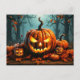 Detta spooktaculära Halloween-vykort har flera lysande pumpor i skogen efter mörk. Du kan gärna lägga till din unika text och adress på baksidan av det här vykortet.