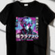 Här är en animerad och mangainspirerad t-shirt-design med en cyberpunk-stil-animerad karaktär med glödande neon ögon, glanseffekter och japansk text med texten "Neo Tokyo" 🎮 🌆 ✨