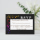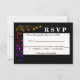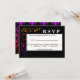 Mycket modernt OSA- och menykort som passar öga. Färga nyblommor och löv på viner med svart bakgrund. Ett hörn i blommigten ram på framsidan och en blomma mönster på baksidan. Anpassa texten till informationen. Matchande produkter finns tillgängliga eller överför den här designen till andra produkter. Filtrerad vy av bilden till ge vid nyans. Fallsäsongen eller vilken säsong som helst fungerar med denna design.