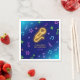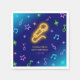 Napkin för elegantens födelsedag med nyare gult mikrofon och färgstarkt musik noter på mörk blått svart mark.