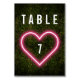 Ett neonhjärta över en bakgrund av boxträ med vit text.