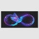 Symbol för oändlighet vid lila med flygande, ljusstark, blå hummingbird på svart bakgrund. Neon.