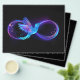 Symbol för oändlighet vid lila med flygande, ljusstark, blå hummingbird på svart bakgrund. Neon.