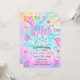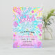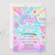 Gör vågor med den här färgglada "Splish Splash" poolparty-inbjudan! Med en livfull tie-dye-bakgrund med tropiska palmlöv och roliga neonformer som flip-flops, flamingos och solsken — är det den perfekta inbjudan för att få dina gäster att bli upphetsade inför en pool-födelsedagsfest!