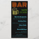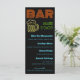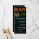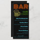 Den här anpassningsbarna eller party-menyn har en neonsignatur pub på en svart bakgrund. Rubriken "PUB" skrivs ut överst i en nyare orange, stil. En bild av en öl placeras nedan, följt av en rad olika provdrycker och cocktailingredienser.