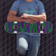 Skateboard i fantastisk har en digitalt skapat bild som liknar en serie mjuka vinkara upplopp mot lugnens strand. Vågar är livliga nyanser av grönt, rosa och blått och har en 3D-kvalitet.