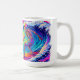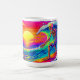 Vibrant neon skeleton surfing mug featuring a colorful sunset wave design. This fun, eye-catching artwork shows a skeleton surfer riding a bright tropical ocean with bold neon colors and soft white feathered edges, printed on a white mug.