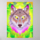 Färgfull digital illustration av en vargs ansikte med vibrerande bakgrund i färg och abstrakt.