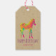 En märkre med födelsedagspresent i coolan, anpassadet säger: Grattis på födelsedagen vildbarn. Designad med en funky, 60 stil-psykodelisk illustration av en baby zebra i nära färg av ljus gult, shock rosa och myntgrönt. Vild och roligt med ett kreativ är en fläck. Sätt på en papper bakgrund för faux-farkosten.