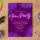 Minimalistisk inbjudan med neonskyltar och titel för att ge inbjudan en lockande look med mörkt violett i bakgrunden med matchande glitteriga tropiska blad