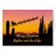 Ett julkort till din brorson och hans familj som visar tomten flyga över öknen. Många kaktus ses i silhuette. Önska en god jul från öknen med ett vackert färgad.