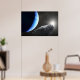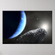 En konstnärs idé om Neptuns lilla måne Hippocamp som upptäcktes av Hubble Space Telescope 2013. Bara 20 miles över kan det faktiskt vara ett avbrutet fragment från ett mycket större grannland måne, Proteus, som ses som ett halvmåne i bakgrunden. Detta är det första beviset för att ett måne är ett avsteg från en kometkollision med ett mycket större föräldraorgan.