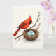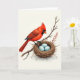 Det här kortet visar en rikligt detaljerad röd fågel som sitter på en jordbrun, knuten gren mot en off-white bakgrund och vakar över ett närliggande bo med en öm, skyddande fokus ❤️. Fågelns tofs reser sig prydligt ovanför huvudet och dess mörka ögon riktas mot boet som om den håller sällskap med det hon vaktar. Dess långa stjärt svänger smalt bakom den medan mörka fötter kröker sig försiktigt runt grenen i ett stadigt, varligt grepp. Bredvid den sitter ett tätt flätat bo gjort av tunna kvistar och fibrer, placerat så nära att det antyder närhet och tyst tillgivenhet. Inuti boet ligger tre blekt blå ägg med fina mörkare fläckar som ger en mjuk kontrast till de varma röda och bruna nyanserna 🌼. Eventuell hälsning visas centrerad nära toppen i en dämpad grå ton, med en mindre textrad