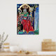 Färgstark, vibrerande, contemporary färgad i guld,blå,röd,grönt,brunt färg . En mystisk hypnotisk trollkarl med elegant vackra rött sammetstumpar som håller en magisk sfär sitta på en gotisk tron med gargotyp och uggla. Ambient är surrealistiskt, fantastiskt, alkemi, där man ser en jester dricka från ett kopp, ett templärt munk som flyger på en groda, genomskinliga bubblor, fantasylandskap med helvetelbrand, kosmisk blå himmel med stjärnor, berg av himmel,träd . Egg Tempera på träpanel med guldfolie. 1989. , Miniature Made with pictorical technologies of 1300 by Alessandro Lumini (c) Det är också en vacker fantasi för jul, Helgdag, födelsedag, Nyårsafton dag, Mardi Gras och Carnival hälsning.