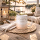 Strandneutral typografidesign i vitt och taupe med en bred färgblockbas med serif Coastal Sips-bokstäver. Modern kuststil för sjöhus-kök, ljusa trädgårdsbryggor och strandnära morgonkafferutiner som söker ren kontrast och raffinerad stranddetalj.