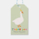 Whimsical Silly Goose baby shower favor tag featuring a charming goose illustration, colorful rainbow lettering “thank you”, and a modern bright green background, with a gender neutral gingham pattern on the back.Perfect for celebrating a mama to be.