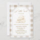 Celebrate your little lamb with this elegant gender neutral baby shower invitation featuring a soft watercolor lamb illustration framed inside a modern arched layout and warm beige gingham border.