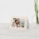 Stilfull tack-kort mall design för ett destination bröllop på stranden med en bild av bruden och brudgummen på framsidan och anpassad text - ett monogram och meddelande på insidan - som kan anpassas. Neutral vit, beige / sand och taupe färger.