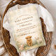En charmfull landsbygdsdesign med en fluffig kalv, ett sött lamm och små gula kycklingar bland mjuka ängsblommor. Den varma pergamentbakgrunden och dämpade jordtoner skapar en mysig, rustik atmosfär med en mjuk sagobokskänsla. Diskret grönska ramar in layouten medan illustrationen av lantbruksdjur tillför värme och personlighet. Perfekt för en neutral landsbygdstematisk firande med klassisk lantgårds charm.