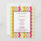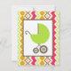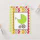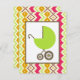 En neutralt barnduschinbjudan med en illustration av en grönt baby-vagn över en bakgrund av rosa, grönt, orange, guld och burgundära staminspirerade mönster. Anpassa texten på baksidan med information om tillfälle.