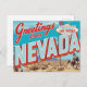 This vibrant, retro-style design captures the dramatic contrast of the Silver State. It features the classic "Greetings from NEVADA" typography alongside the iconic "Welcome to Fabulous Las Vegas" sign. The scene is set in the rugged desert landscape, complete with cacti and a classic Western cowboy on horseback, blending the excitement of the city with the state's Wild West heritage. Perfect for fans of vintage travel posters, retro artwork, Las Vegas, and the spirit of the desert.