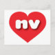 Detta vykort har ett pulserande rött hjärta som innehåller det feta, vita, rundade nedre fodral brev nv, en lekfull förkortning för tillståndet Nevada, silver. Kortets baksida är tom och väntar på din anpassade text eller handskrivna stämningar.