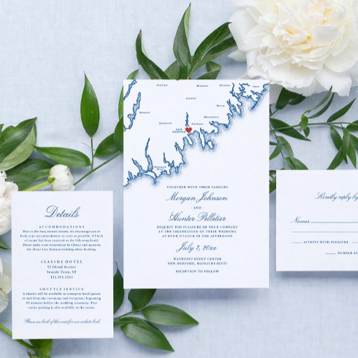 Invite guests to your New Bedford wedding rehearsal dinner with this elegant navy blue South Coast MA invitation, featuring a timeless coastal map design. Perfect for events at Candela Cucina, Waypoint Event Center, Merrill’s On the Waterfront, Cotali Mar, Cork Wine & Tapas, New Bedford Whaling Museum, Kilburn Mill, Fort Taber, and Bittersweet Farm. A refined choice for a classic seaside gathering with sophisticated nautical style. Artwork by Coastal Map Designs