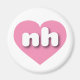 Den här magneten har ett pulserande rosa hjärta som innehåller det feta, vita, rundade nedre fodral brev nh, en lekfull förkortning för New Hampshire, granitstaten.