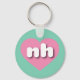 Den här nyckelkedjan har ett dynamiskt hjärta för rosa som innehåller det feta, vita, rundade nedre brev nh, en lekfull förkortning för New Hampshire, granitstaten.