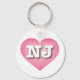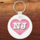 Den här nyckelringen har ett rosa hjärta med ett vitt tvättat centrum som innehåller fetstil, vit, övre fodral brev NJ, officiellen förkortning för New jersey, trädgårdsstaten.