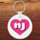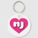 Den här nyckelkedjan har ett skarpt och dynamiskt shock rosa-hjärta som innehåller det feta, rundade, vita nedre fodral-brev nj, en lekfull version av förkortningen för tillståndet New jersey.