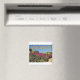 En produkt med ett foto av New mexico och namn i staten på den. Bilden innehåller lila blommor, cacti och ett klart blå himmel.