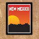 New mexico i vintage resor poster stil med enkla former, rik vibrerande färg och ett vintage. Ett svart bergsilhuett ligger framför en stor gult sol med orange röd himlar, som påminner om bergslandskapen runt Santa Fe, Taos eller Albuquerque.