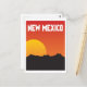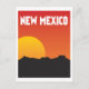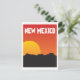 New mexico i vintage stil med enkla former, rik vibrant färg och vintage. Ett svart bergsilhuett ligger framför en stor gult sol med orange röd himlar, som påminner om bergslandskapen runt Santa Fe, Taos eller Albuquerque.