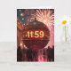 As fireworks burst in the night sky, a large metallic shiny ball shows '11:59' while a crowd gathers beneath an archway to watch the dazzling display.