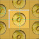 Fabric har rader med sesamsädessäckar som är tryckta på gultens bakgrund. Perfekt till frukost!