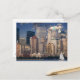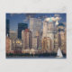 Fantastiskt foto av New York-skylten på kvällen. Bilden har en segelbåt på vattenfronten i förgrunden och bakgrunden är fylld med de många intressanta ljusa och glandiga skyscraperna och byggnad. Bilden togs i skymningen när himlar på kvällen har en skymningsuppfattning.