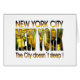 New York design med delen av Midtownhorisonten som är skimrande till och med stora NY-brev och ordstäv "sömnen för stadsdoesn` t…",