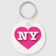 Den här nyckelringen har ett pulserande shock rosa som innehåller det feta, vita, övre fodral brev NY, officiellen förkortning för New York, empire state.