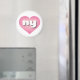 Den här magneten har ett rosa hjärta med ett vitt tvättat centrum som innehåller fet, rundad nedre brev ny i fodral, en lekfull version av förkortningen för New York, empire state.