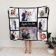 En svart anpassningsbar keepsaksfilt för nya lyweder som innehåller 8 fotokollage av förlovning, bröllopsdag, brudens sida, marskalkar, familj, smekmånaden osv., bilder i vitt ramar, "Lyckligtvis någonsin efter" i ett vitt snyggt, och din namn och bröllop-dejt i ett modernt, vitt bokstäver.