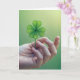 En hand håller delikatligen fyra löv klöver mot en mjuk, suddig grönt för att tänka på dig. Inomliggande meddelande kan ändras.