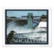 En digital målning av bron i internationell och observationsytan torn vid Niagara Falls i New York. Med det häftiga vattenfallet som snabbt rinner ner i floden nedanför skickar det vatten uppåt i luft. En svart nattbjörn är i grund hörnet bredvid den vita bokstaven "Niagara Falls". Längst upp på målningen med vita bokstäver står "Kanada" och "New York", som visar vilken sida av George som är vem. Målningen har ett mörk blått gräns. Upphovsrätt ©2023 Kimberly J Tilley.