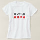 Visar fyra röda blommor, inklusive en Hibiscus-blomma, och ord "Hawaii" ovan i elegant. För hawaier, besökare, turister, amerikaner, trädgårdsmästare, att minnas en semester eller Hawaiis anda. Gå in i alfatandan med den här fina designen.